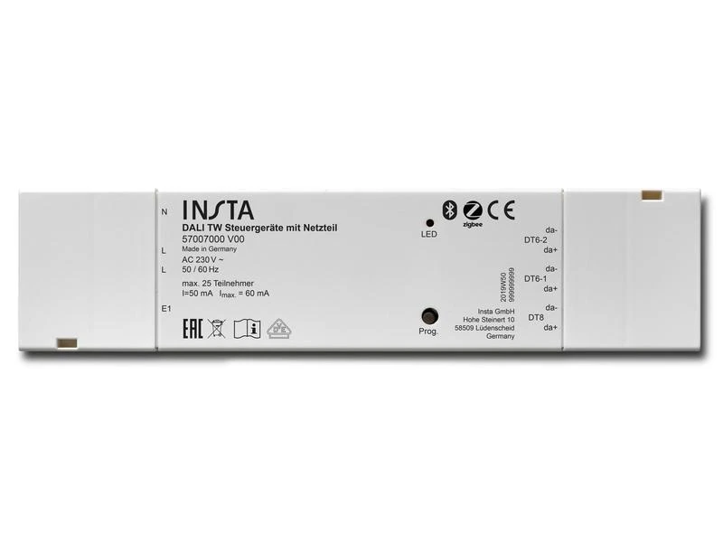 DALI-Steuergerät dient zur Einbindung von Leuchten mit DALI-Schnittstelle in ein Zigbee 3.0 System. Es unterstützt die Einstellung der Farbtemperatur für Leuchten mit DALI Device Type 8 und Type 6 gemäss IEC 62386-209. Das Modul besitzt einen Eingang zum Anschluss eines Tasters. Die Installation erfolgt in der DALI-Leuchte oder in die Zwischendecke. Einschaltund