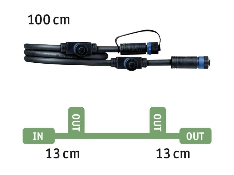 Mit diesem Plug & Shine Verbindungskabel überbrücken Sie eine Entfernung von einem Meter. Dank seinen drei Anschlüssen, haben Sie die Möglichkeit weiteres Zubehör oder Plug & Shine Leuchten anzubringen. Abgänge welche Sie nicht benötigen, können Sie mit den mitgelieferten Abdeckkappen sicher verschliessen. Diese gewährleisten den IP68-Tauchwasserschutz. In Kombination mit den Leuchten und Trafos aus der Pllug & Shine Serie, beleuchten Sie Ihren Aussenbereich ganz nach Ihren Wünschen.