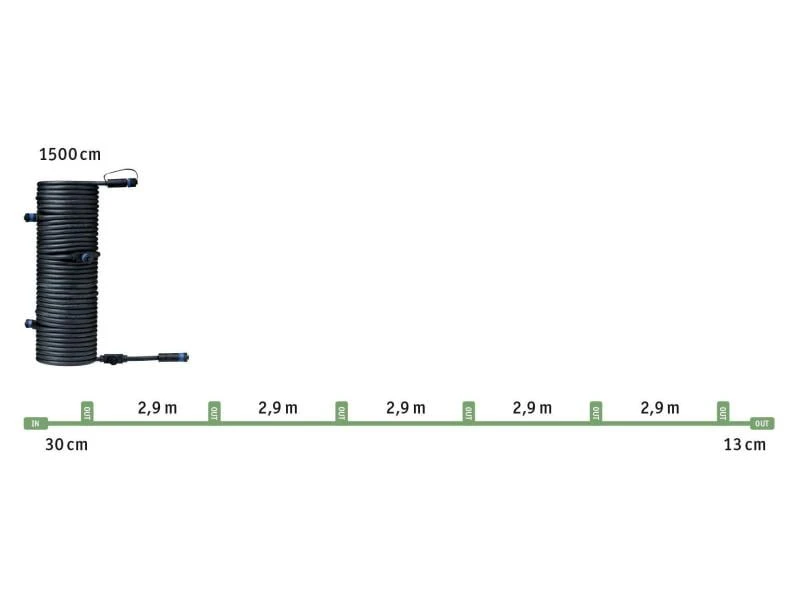 Mit diesem Plug & Shine Verbindungskabel überbrücken Sie eine Entfernung von 15 Meter. Dank seinen sieben Anschlüssen, haben Sie die Möglichkeit weiteres Zubehör oder Plug & Shine Leuchten anzubringen. Abgänge welche Sie nicht benötigen, können Sie mit den mitgelieferten Abdeckkappen sicher verschliessen. Diese gewährleisten den IP68-Tauchwasserschutz. In Kombination mit den Leuchten und Trafos aus der Pllug & Shine Serie, beleuchten Sie Ihren Aussenbereich ganz nach Ihren Wünschen.
