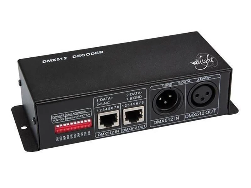 Der DMX Controller ermöglicht die einfache Steuerung von LED-Leisten. Der Controller verfügt über vier Kanäle und bietet eine Auswahl von vier einfarbigen Programmen sowie über einen RGBW-Modus, der grün, rot, blau und weiss steuert. Dem Benutzer werden zwei verschiedene Nutzungsmodi zur Auswahl gestellt: der voreingestellte DMX-Modus oder der automatische Modus. Die Auswahl kann über den integrierten DIP-Schalter getätigt werden und garantiert somit hohen Komfort und leichte Bedienung.